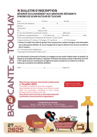 Brocante de Touchay dimanche 27 juillet 2025. Pour vous inscrire, vous trouverez les bulletins d'inscriptions dans la zone téléchargements ci-dessous